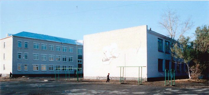 Здание типовое, разработанное для целинных регионов страны- Союза Советских Социалистических Республик. Материалом послужил кирпич, шлакоблок и бутовый камень.